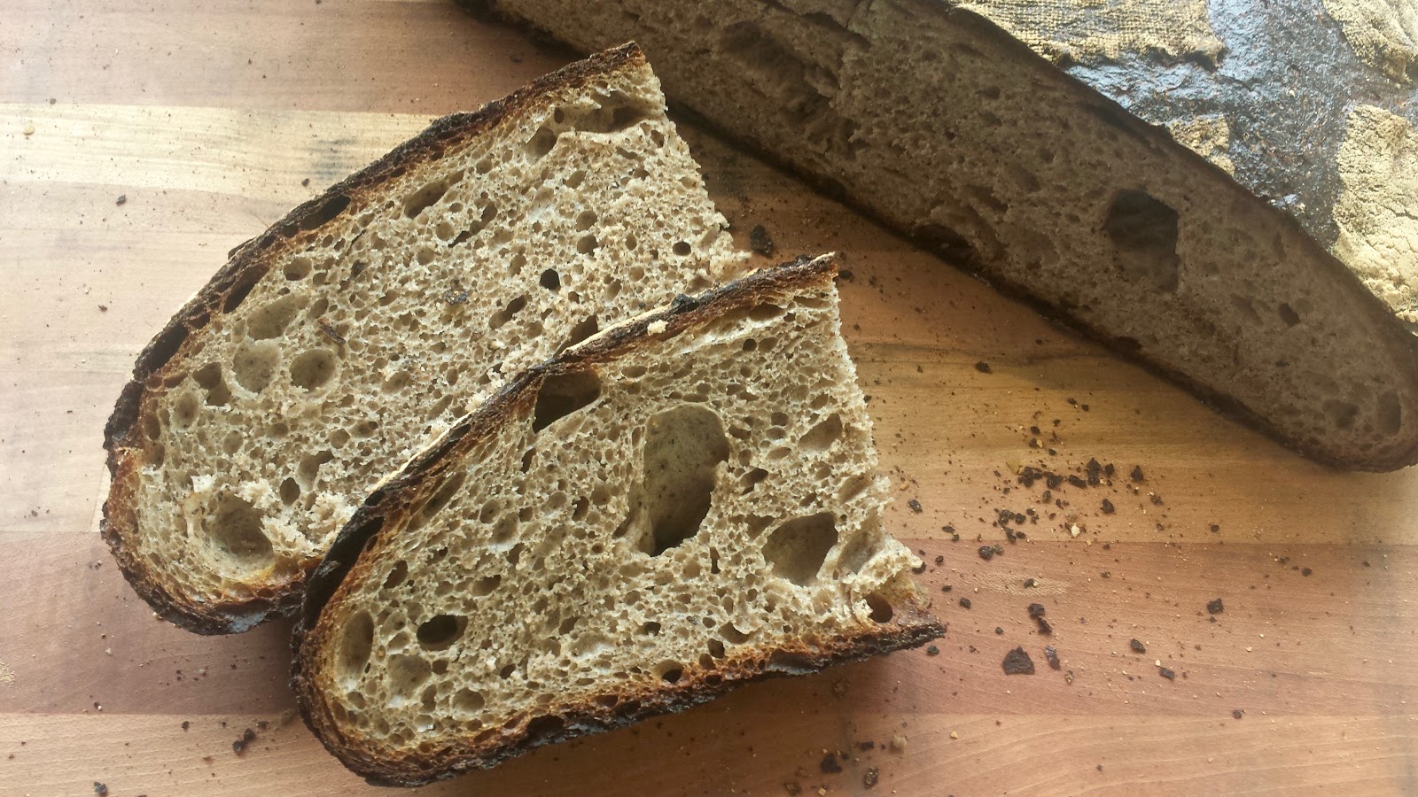Here’s the story of how it’s made: It has its own unique starter which is fed and allowed to ferment for 12 hours or so. We autolyze the rest of the flours and water (it’s an 83% hydration bread which means it’s really wet) for two hours. Then add the starter and salt a bit more water and gently mix it for 2 minutes. We fold it three times at 30-minute intervals; allow it to ferment for an additional 2 ½ hours before dividing it. After a preshaping, it rests for 30 minutes or so, gets a gentle final shaping and then into the large baskets where it is allowed to get its final fermentation before baking. It’s bake for a bit more than an hour at about 450º. Then it needs to cool for a couple of hours or ideally overnight. Then slice it and enjoy!