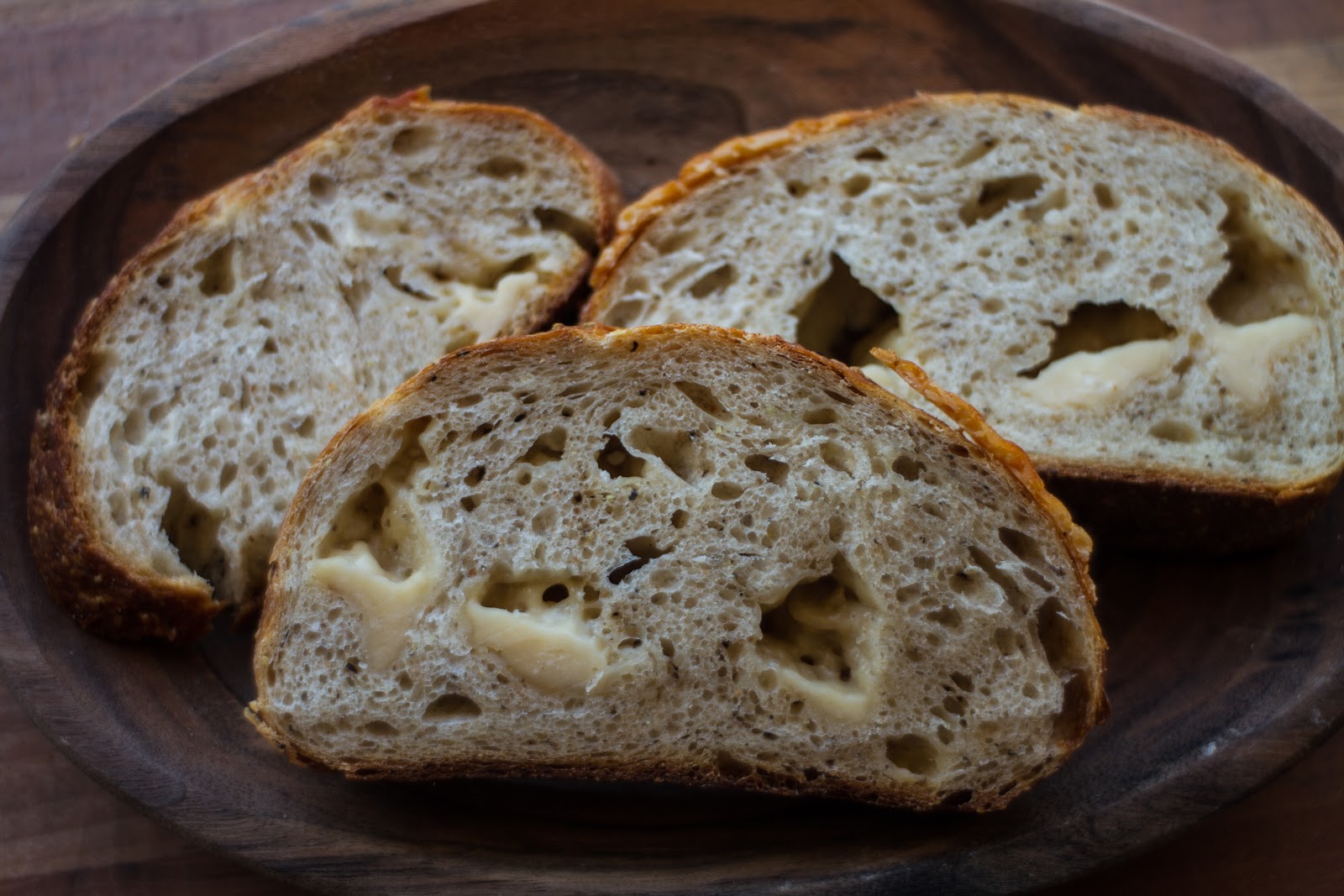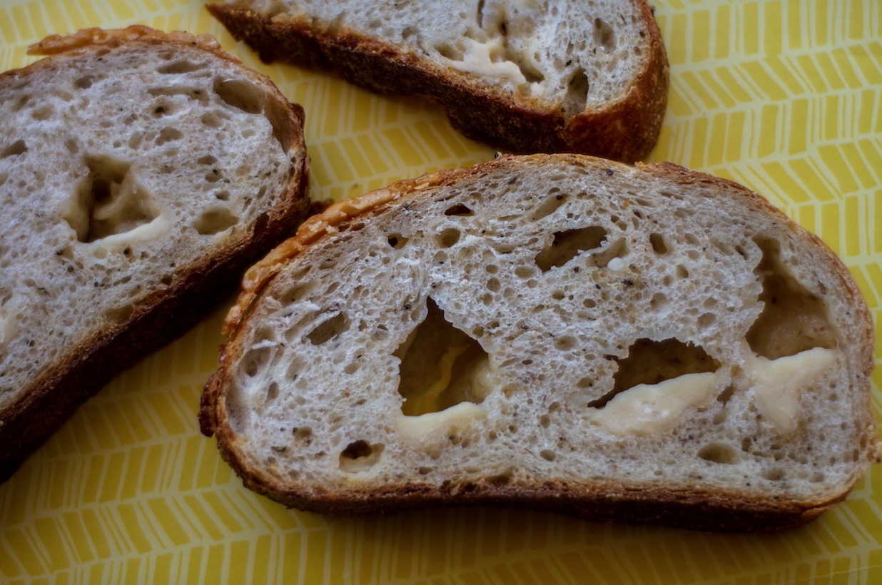 The new loaf has even more depth of flavor with notes of rich browned butter in the cheese and floral brightness in the pepper. The flavor and integrity of the dough has been elevated as well. All of the cheese in the loaf is now in the form of chunks. In the prior recipe, half the cheese was grated and the other half cubed. This change has improved the texture of the crumb and really brings out the cheese (crumb is the term for the inside of the bread). Overall we think it’s a 3-prong improvement in what was already one of our favorite and most popular specialty breads. All this flavor comes at a premium price, but we know it’s worth it. We hope you agree. Ask us for a taste!