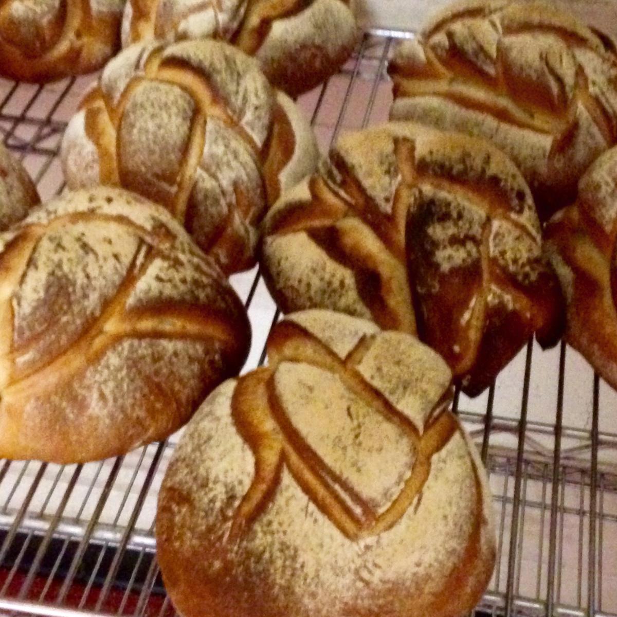 Not surprisingly, the menu also included several loaves of bread. Renato, Filippo, Frank, and Amy baked all day making Pane Nero di Castelvetrano, Due Macine, Pizza Bianca a Pala, Quadrucci Secchi, as well as Cannoli Siciliani for dessert. We were particularly taken with the Due Macine, which translates to twice milled. It was a crusty wheat bread with a striking appearance, created by braiding half of the dough and wrapping it around the loaf before baking. We’ll keep practicing and maybe you’ll see it emerging from a Bakehouse oven someday.